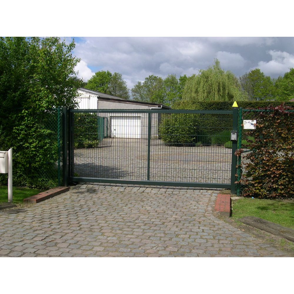 Remplissage: Panneau double fils 8/6/8, mailles 200x50 Accessoires: Montures à galets reglables Serrure inoxydable canon Européen Traitements: grenaillage + métallisation + époxy zinc 80μ + thermolaquage polyester 80μ