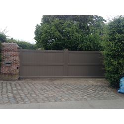 Remplissage: Lames en aluminium à emboitement, largeur 140mm parclosées dans le cadre Accessoires: Rail à sceller type S7 Serrure inoxydable canon Européen Traitements: ; grenaillage + métallisation + époxy zinc 80μ + thermolaquage polyester 80μ