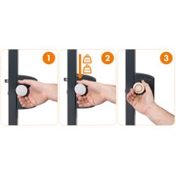 Bouton de sécurité en polyamide et en aluminium anodisé. Evite l'accès aux enfants, il est nécessaire d'appuyer un ergot minimum et de tourner, double action simultanée. Conforme à la norme de sécurité piscine Française NF P90-306. |