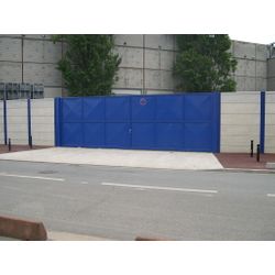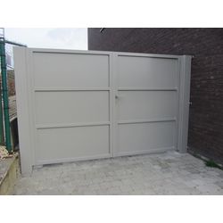 Remplissage: Tôle pleine ép 3mm soudée dans le cadre Accessoires: Gonds réglables M16 à M30 suivant largeur Serrure inoxydable canon Européen Butée centrale et verrouillage en position ouverte et fermée Traitements: grenaillage + métallisation + époxy zinc 80μ + thermolaquage polyester 80μ