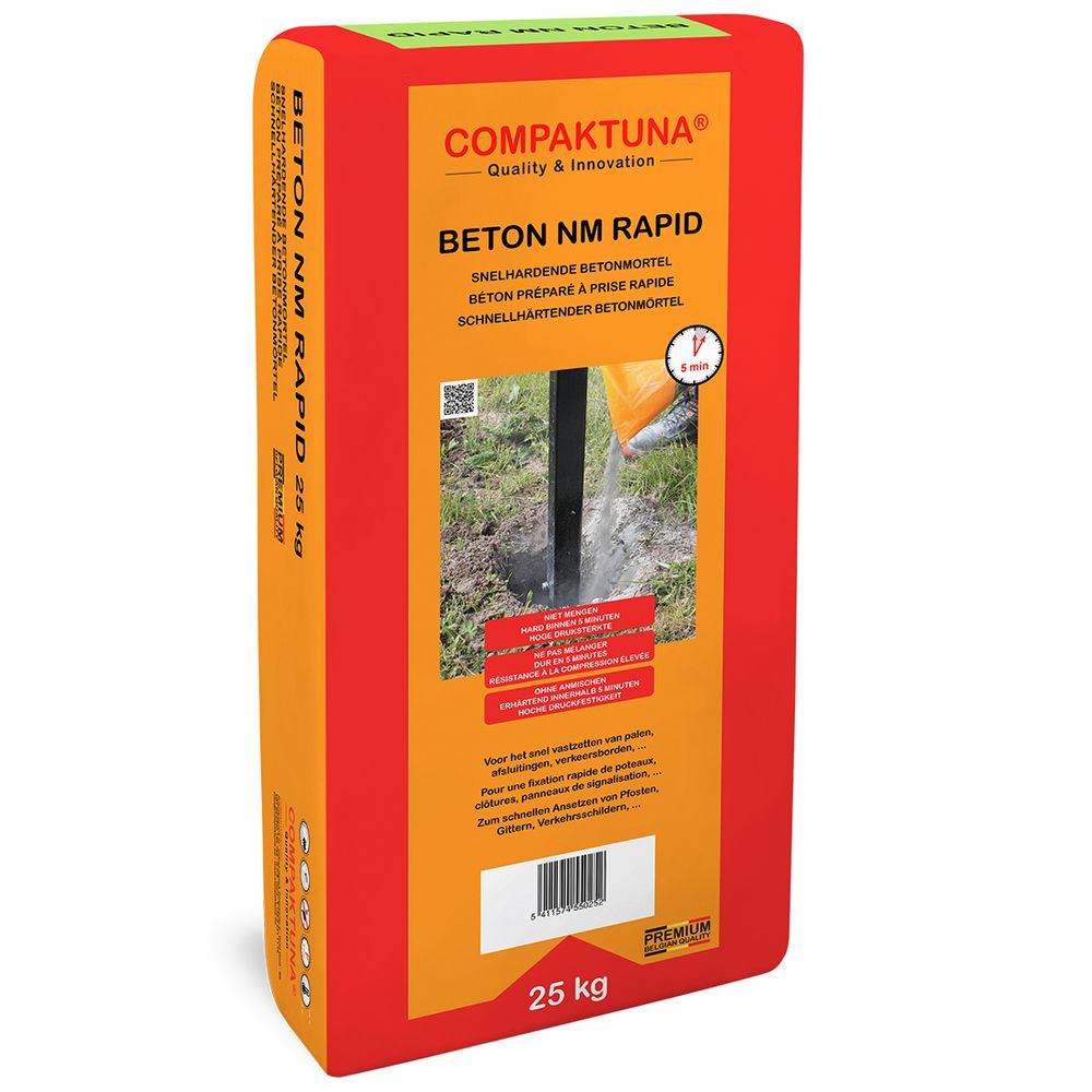 BETON NM RAPID is een droge, gebruiksklare, snelhardende betonmortel die als voornaamste kenmerk heeft dat deze kan verwerkt worden door uit te gieten in water, zonder te mengen. BETON NM RAPID verhardt binnen 5 minuten.