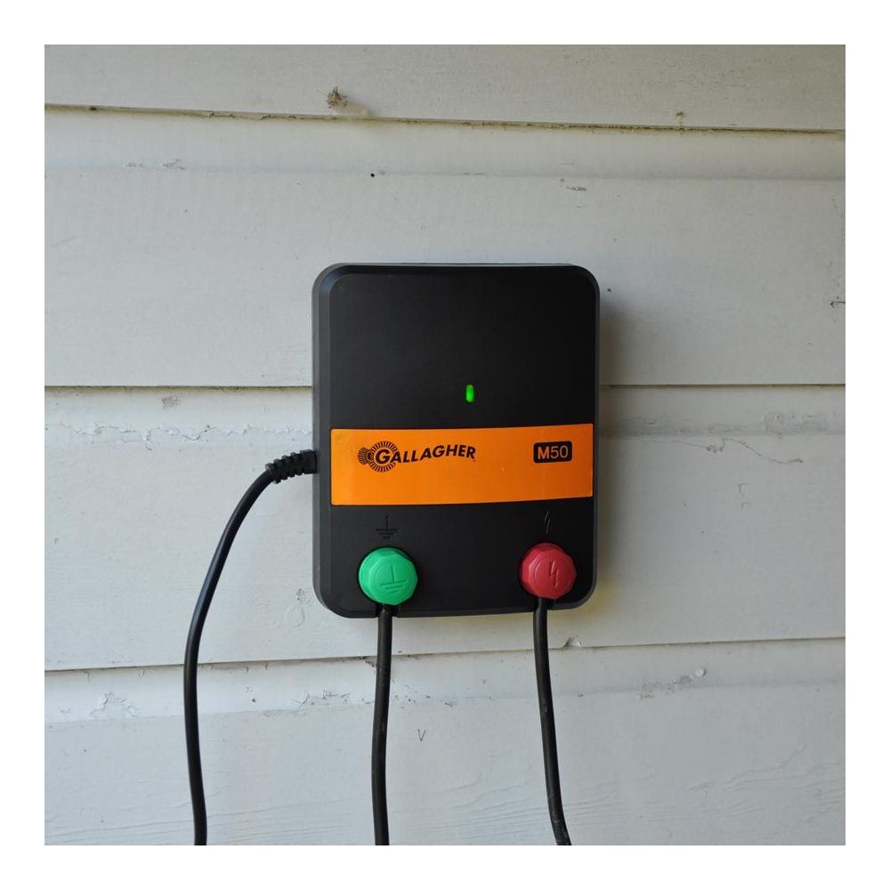 De M50 is een lichtnet schrikdraadapparaat dat geschikt is voor korte afrasteringen tot een lengte van 4 km. Dit eenvoudig te bedienen apparaat is ook bij uitstek geschikt voor het binnenhouden van huisdieren zoals konijnen, honden en katten, of het weren van kleine roofdieren. Het schrikdraadapparaat wordt veel gebruikt in tuinen met een oppervlakte tot ca. 120 m2. De M50 is zeer eenvoudig te installeren. Het apparaat verbruikt weinig stroom en heeft een ingebouwde bliksembeveiliging. Gebruik voor dit schrikdraadapparaat 1 aardpen van 1m (art:008735)
