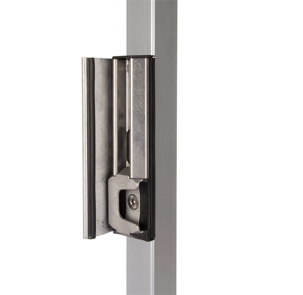 Verstevigde roestvrijstalen slotvanger met kunststof afwerking voor al uw poorten. Het gepatenteerde verankeringssysteem verhindert het uit elkaar trekken van de poort. De unieke Quick-Fix bevestiging zorgt voor een snelle en sterke montage. De geëxtrudeerde slagplaat met stootrubber is regelbaar voor poortprofielen tot 60 of 80 mm. Het nieuwe ontwerp verzekert een nog makkelijkere sluiting van de poort.